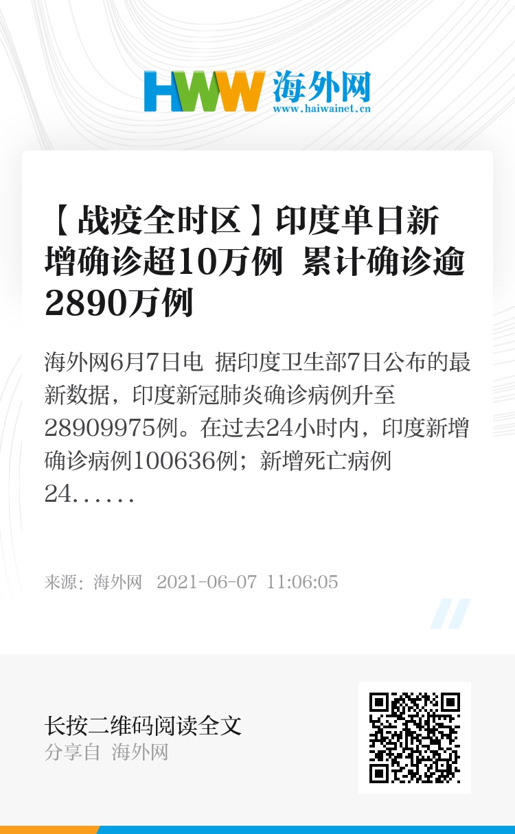 海外网6月7日电 据印度卫生部7日公布的最新数据,印度新冠肺炎确诊病例升至28909975例。在过去24小时内,印度新增确诊病例100636例;新增死亡病例2427例,累计死亡病例达349186例。(海外网 汪晓宇)