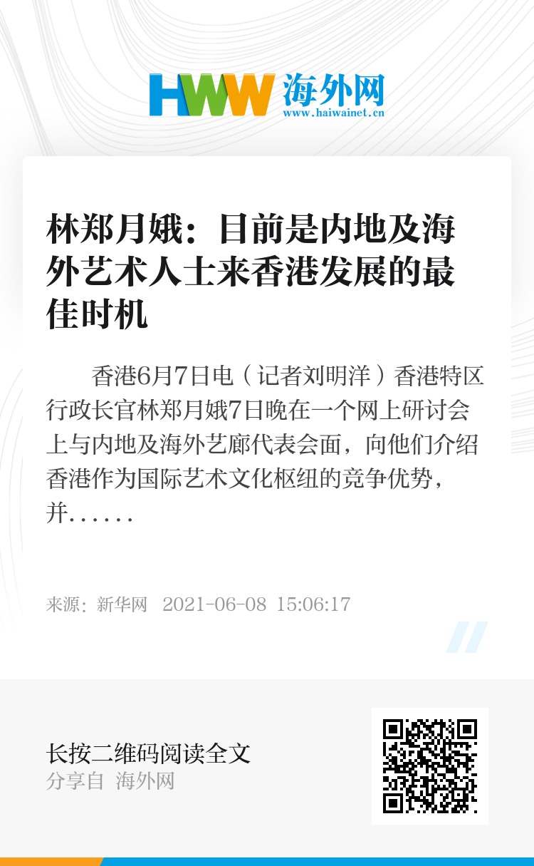 新华社香港6月7日电(记者刘明洋)香港特区行政长官林郑月娥7日晚在一个网上研讨会上与内地及海外艺廊代表会面,向他们介绍香港作为国际艺术文化枢纽的竞争优势,并指出目前是他们来港扩张发展的最佳时机。