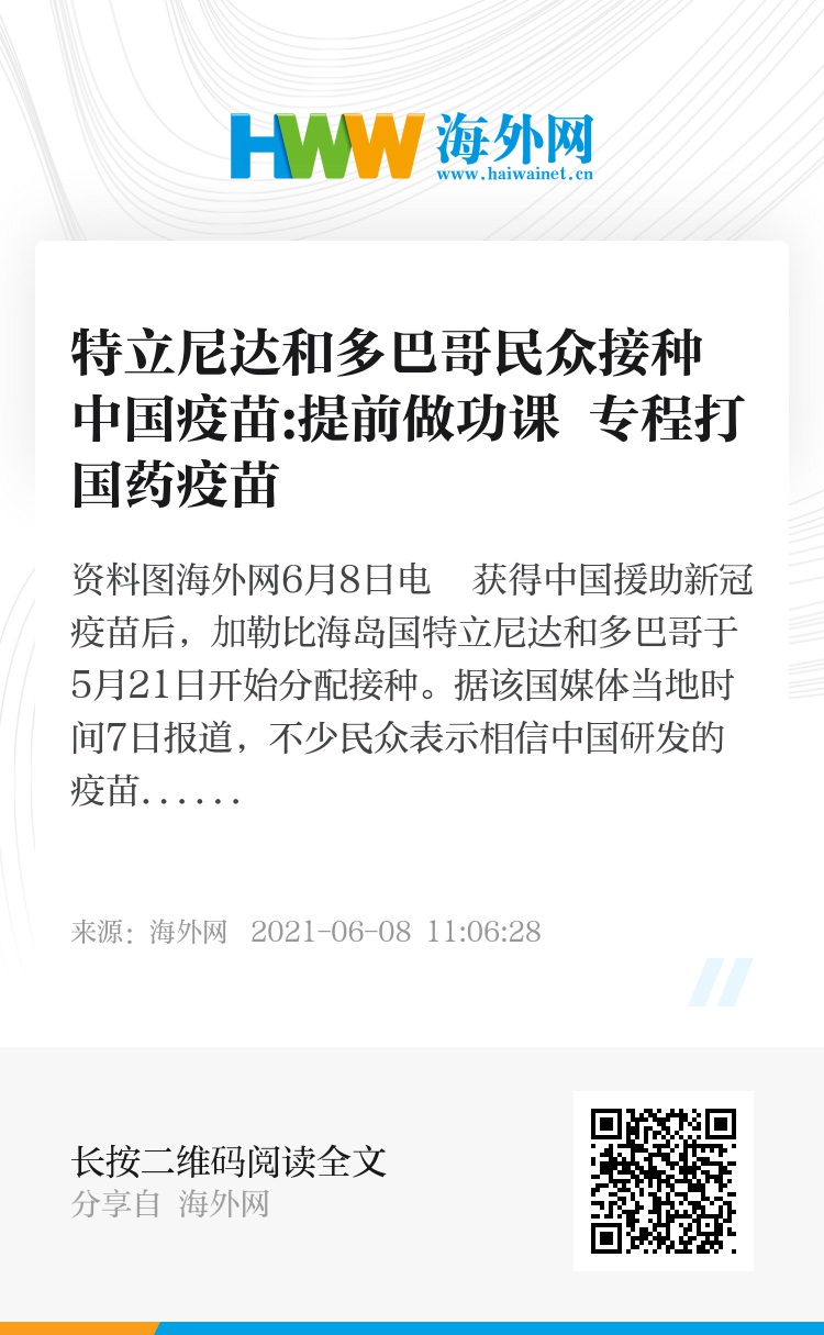 海外网6月8日电 获得中国援助新冠疫苗后,加勒比海岛国特立尼达和多巴哥于5月21日开始分配接种。据该国媒体当地时间7日报道,不少民众表示相信中国研发的疫苗,专程前往接种。