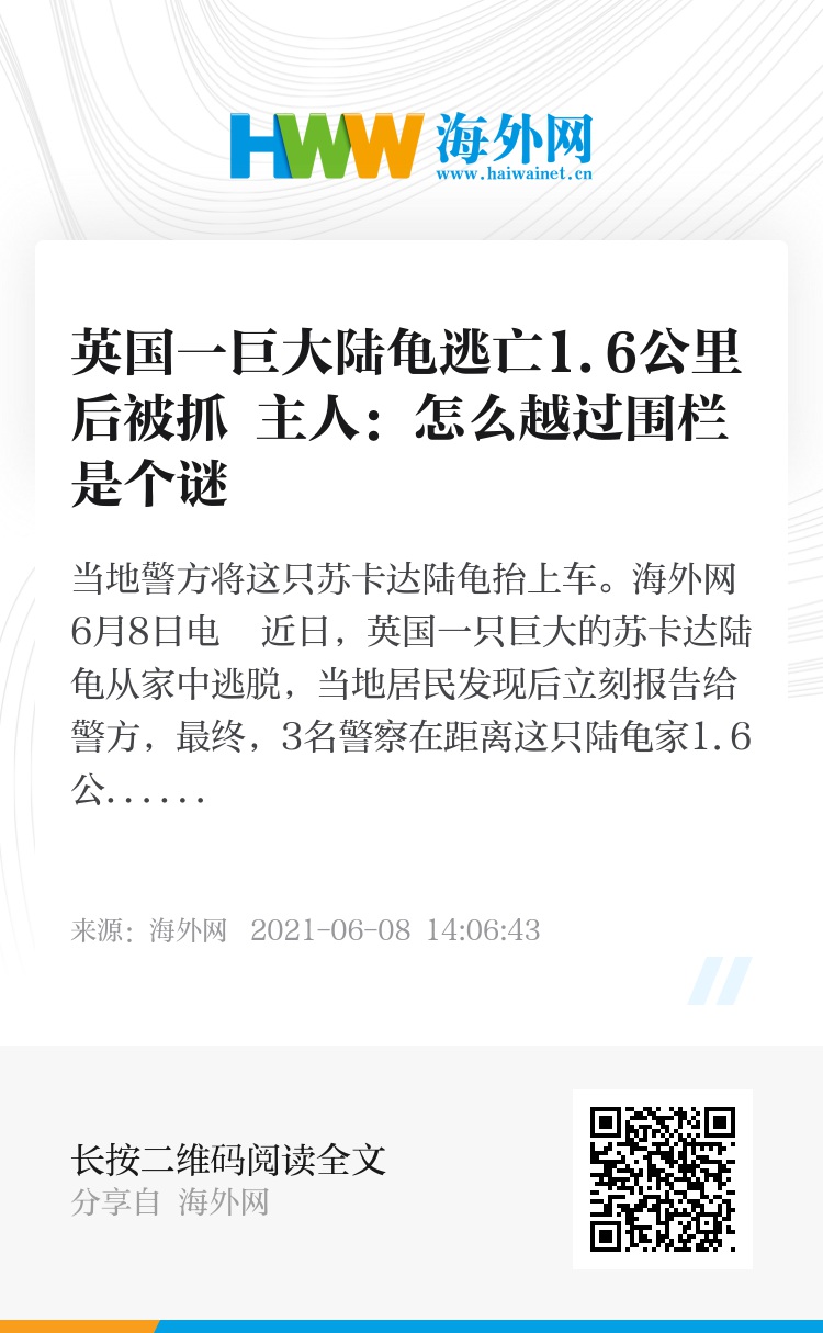 海外网6月8日电 近日,英国一只巨大的苏卡达陆龟从家中逃脱,当地居民发现后立刻报告给警方,最终,3名警察在距离这只陆龟家1.6公里的地方抓住了它。