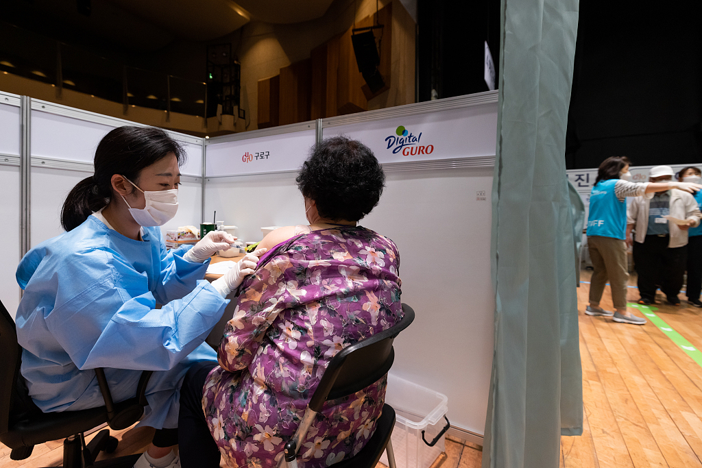 当地时间2021年6月8日,韩国新冠疫苗接种工作持续进行。7日,韩国总统文在寅说,韩国新冠疫苗接种提速,预计到9月底将有3600万人,约总人口的70%,接种至少一剂疫苗。韩联社报道,这意味着韩国可能早于先前计划实现群体免疫。图源:人民视觉