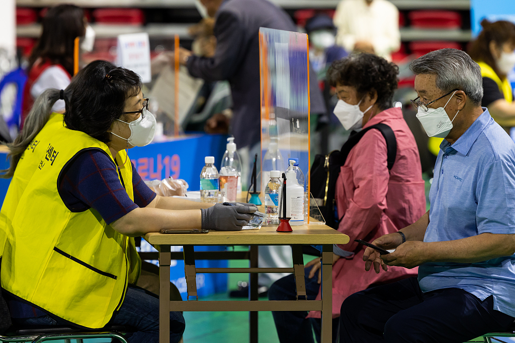 当地时间2021年6月8日,韩国新冠疫苗接种工作持续进行。7日,韩国总统文在寅说,韩国新冠疫苗接种提速,预计到9月底将有3600万人,约总人口的70%,接种至少一剂疫苗。韩联社报道,这意味着韩国可能早于先前计划实现群体免疫。图源:人民视觉