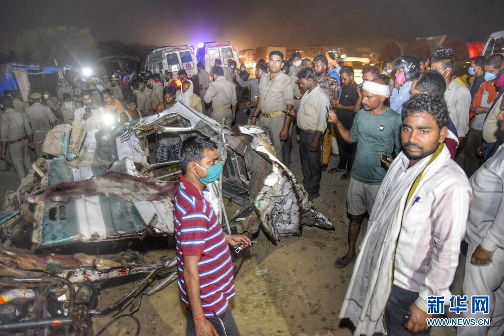 6月8日晚,人们聚集在印度北方邦坎普尔讷格尔地区的车辆相撞事故现场。据印度媒体9日报道,印度北方邦8日夜间发生公交车与货车相撞事故,导致至少17人死亡。新华社发