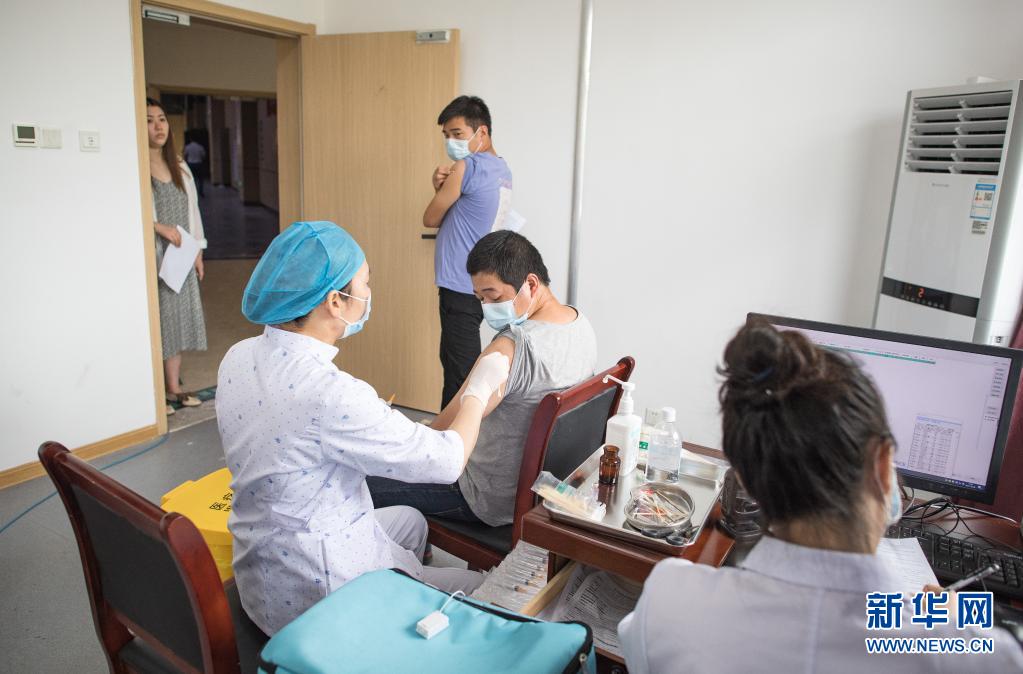 6月9日,市民在武汉江夏方舱医院接种新冠疫苗。随着武汉新冠疫苗接种工作的推进,为方便市民接种,疫情期间以中医院运转模式进行临床治疗、管理的武汉江夏方舱开始向市民提供接种服务。截至6月9日12时,江夏方舱医院共接种疫苗38864剂次。新华社记者 肖艺九 摄