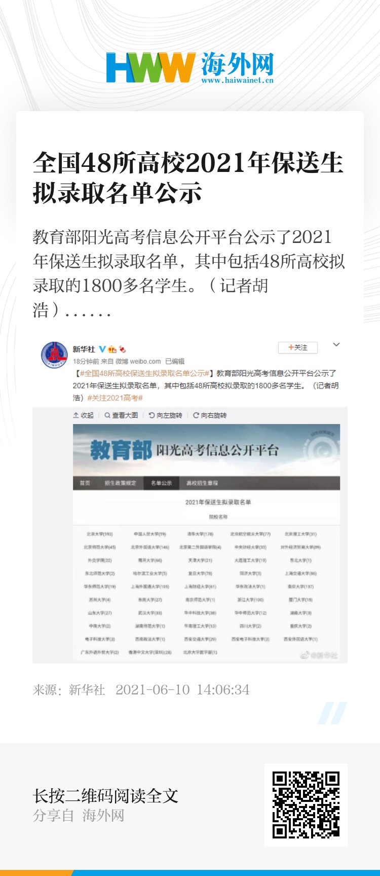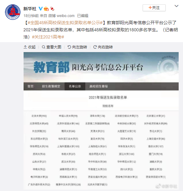 教育部阳光高考信息公开平台公示了2021年保送生拟录取名单,其中包括48所高校拟录取的1800多名学生。(记者胡浩)
