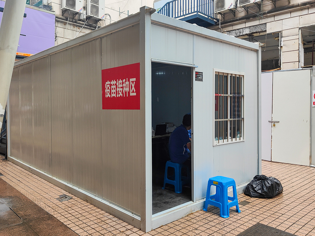 工作人员使用一间活动板房用于新冠疫苗接种,地铁出口处设置了接待点,一旁设置了留观区,不少市民在登记,留观区内接种完疫苗的市民正在休息。图片来源:人民视觉
