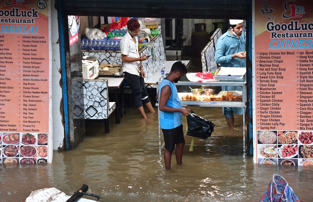 当地时间2021年6月9日,印度孟买遭遇暴雨,街道积水严重。图片来源:人民视觉
