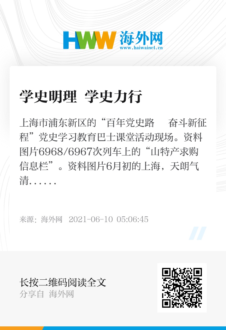 这是上海市浦东新区区委宣传部联合有关单位推出的“百年党史路 奋斗新征程”党史学习教育巴士课堂。乘上这辆巴士,人们将从中共一大会址出发,途经渔阳里、中共二大会址、五卅运动纪念碑、浦东开发陈列馆等20多处红色地标,开启一段100分钟的“沉浸式”党史学习之旅。