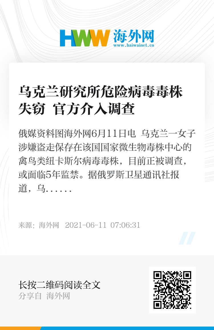 海外网6月11日电 乌克兰一女子涉嫌盗走保存在该国国家微生物毒株中心的禽鸟类纽卡斯尔病毒毒株,目前正被调查,或面临5年监禁。