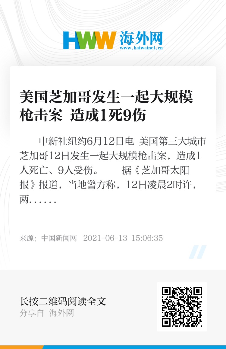 中新社纽约6月12日电 美国第三大城市芝加哥12日发生一起大规模枪击案,造成1人死亡、9人受伤。