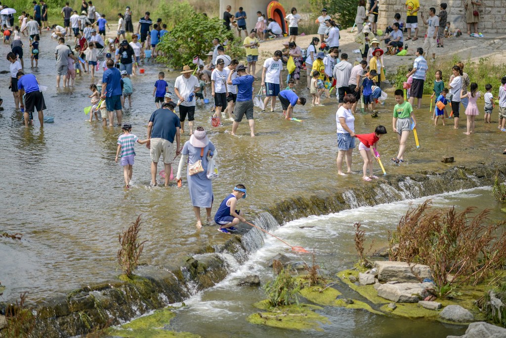 6月13日,山东省济南,泉城持续高温天气,最高气温达到了35℃,近郊亲水纳凉逐渐热起来。在市中区罗而庄村附近的玉符河,这里是网红纳凉打卡地,清澈的河水沿着地势流淌,在低洼处形成层层瀑布,众多市民在河道内戏水纳凉,感受山泉水带来的清凉。 图片来源:ICphoto
