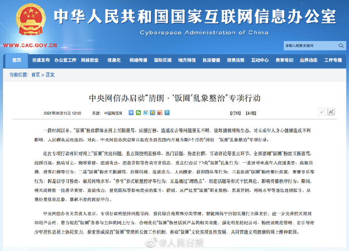 据中央网信办消息,即日起,在全国范围内开展为期2个月的“清朗·‘饭圈’乱象整治”专项行动。专项行动将重点围绕明星榜单、热门话题、粉丝社群、互动评论等重点环节,全面清理“饭圈”粉丝互撕谩骂、拉踩引战、挑动对立、侮辱诽谤、造谣攻击、恶意营销等各类有害信息,重点打击5类饭圈乱象行为: