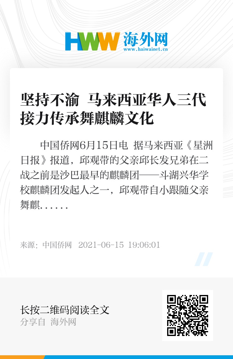 中国侨网6月15日电 据马来西亚《星洲日报》报道,邱观带的父亲邱长发兄弟在二战之前是沙巴最早的麒麟团——斗湖兴华学校麒麟团发起人之一,邱观带自小跟随父亲舞麒麟,至今逾半世纪传承三代人,对传扬麒麟文化坚持不渝。