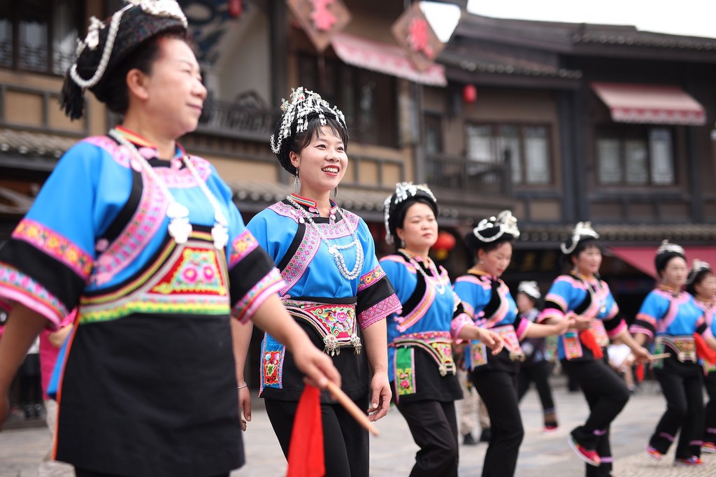 图为6月12日,水族同胞在贵州省丹寨县万达小镇景区表演传统舞蹈。图片来源:IC photo