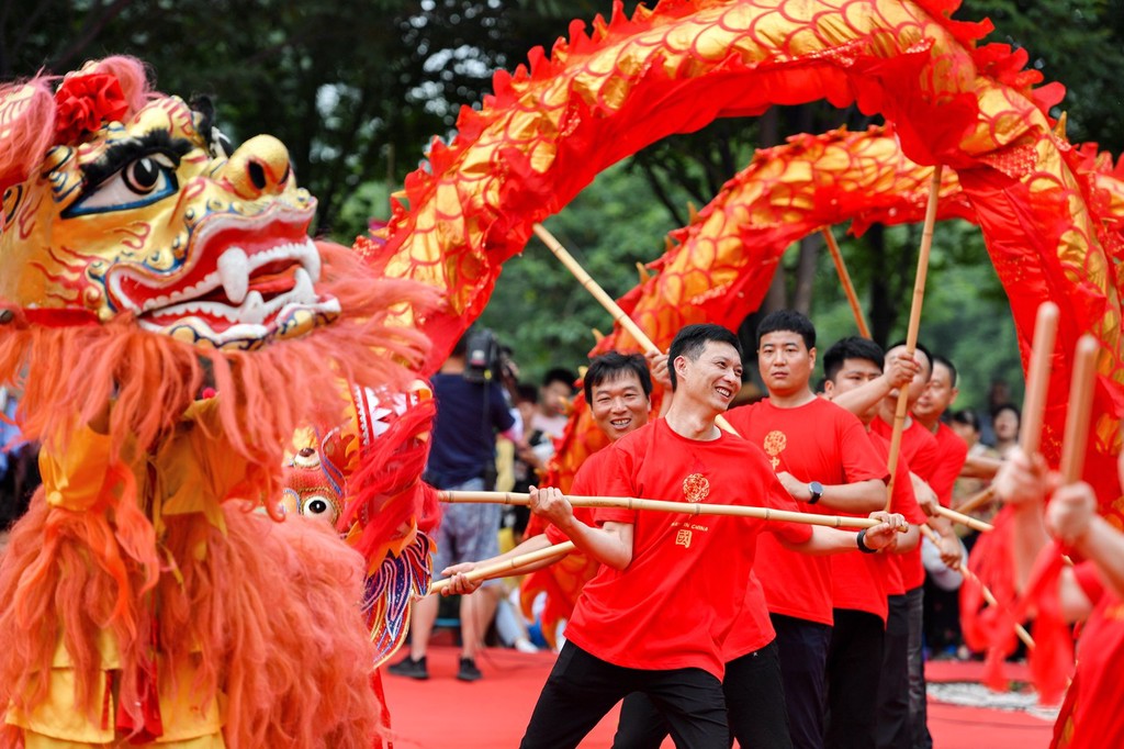 据文旅部,2021年端午节假期三天(6月12-14日),全国国内旅游出游8913.6万人次,按可比口径同比增长94.1%。实现国内旅游收入294.3亿元,同比增长139.7%。图为6月13日,浙江省湖州市长兴县虹星桥镇白水村蠡塘渔村,当地村民与外地游客一起体验刘井舞狮非遗民俗表演。图片来源:IC photo