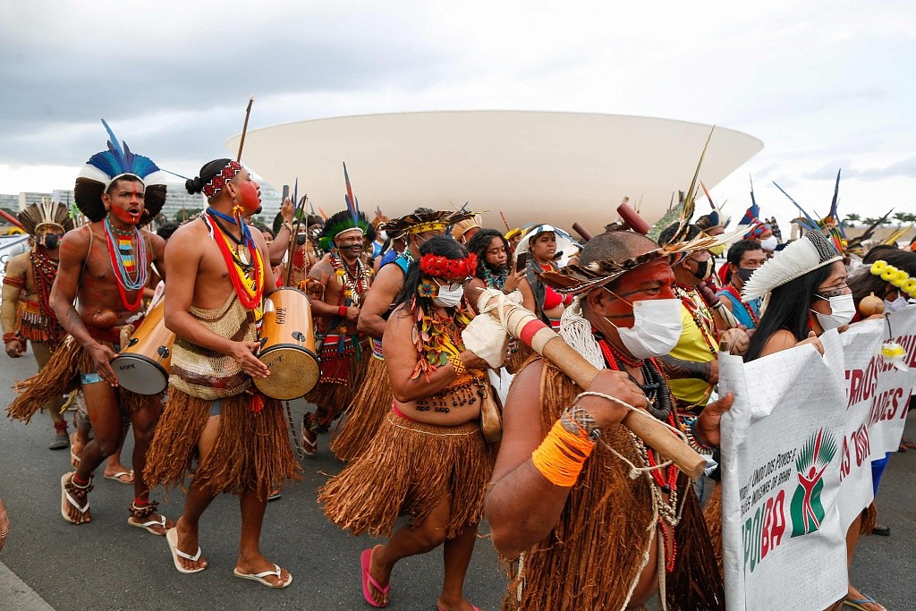 当地时间6月14日,来自不同地区的巴西原住民聚集在首都巴西利亚的最高法院外抗议,反对在原住民居住地非法开采矿场,并抗议巴西总统博索纳罗此前的言论。图片来源:人民视觉