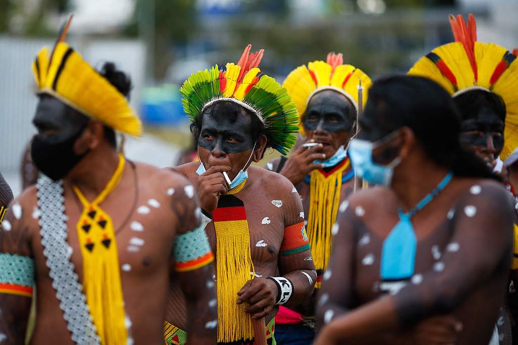 当地时间6月14日,来自不同地区的巴西原住民聚集在首都巴西利亚的最高法院外抗议,反对在原住民居住地非法开采矿场,并抗议巴西总统博索纳罗此前的言论。图片来源:人民视觉