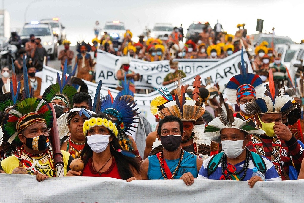 当地时间6月14日,来自不同地区的巴西原住民聚集在首都巴西利亚的最高法院外抗议,反对在原住民居住地非法开采矿场,并抗议巴西总统博索纳罗此前的言论。图片来源:人民视觉