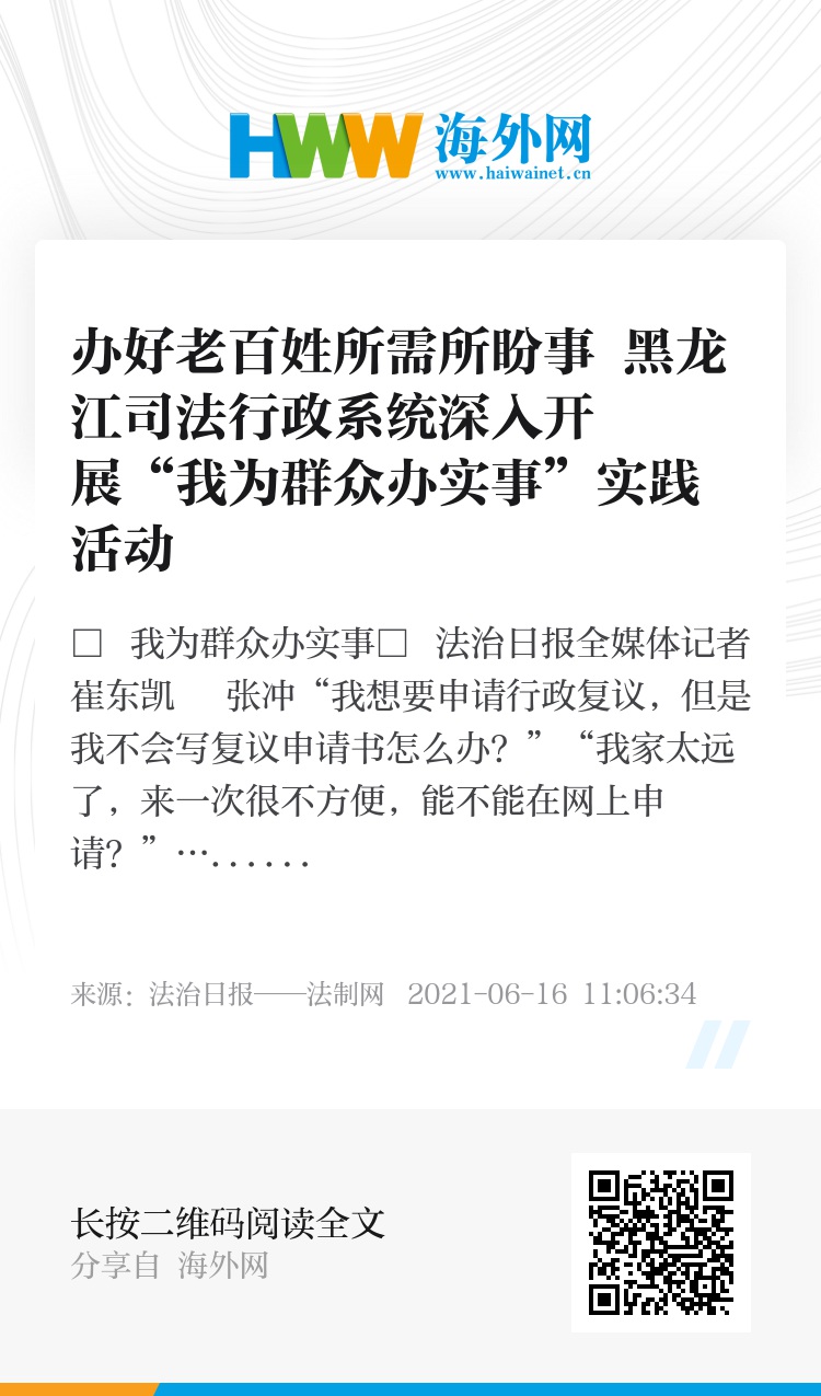 《法治日报》记者了解到,政法队伍教育整顿开展以来,黑龙江司法行政系统把党史学习教育与政法队伍教育整顿紧密结合起来,深入开展“我为群众办实事”实践活动,用为群众办实事的实际成果检验教育整顿成效。