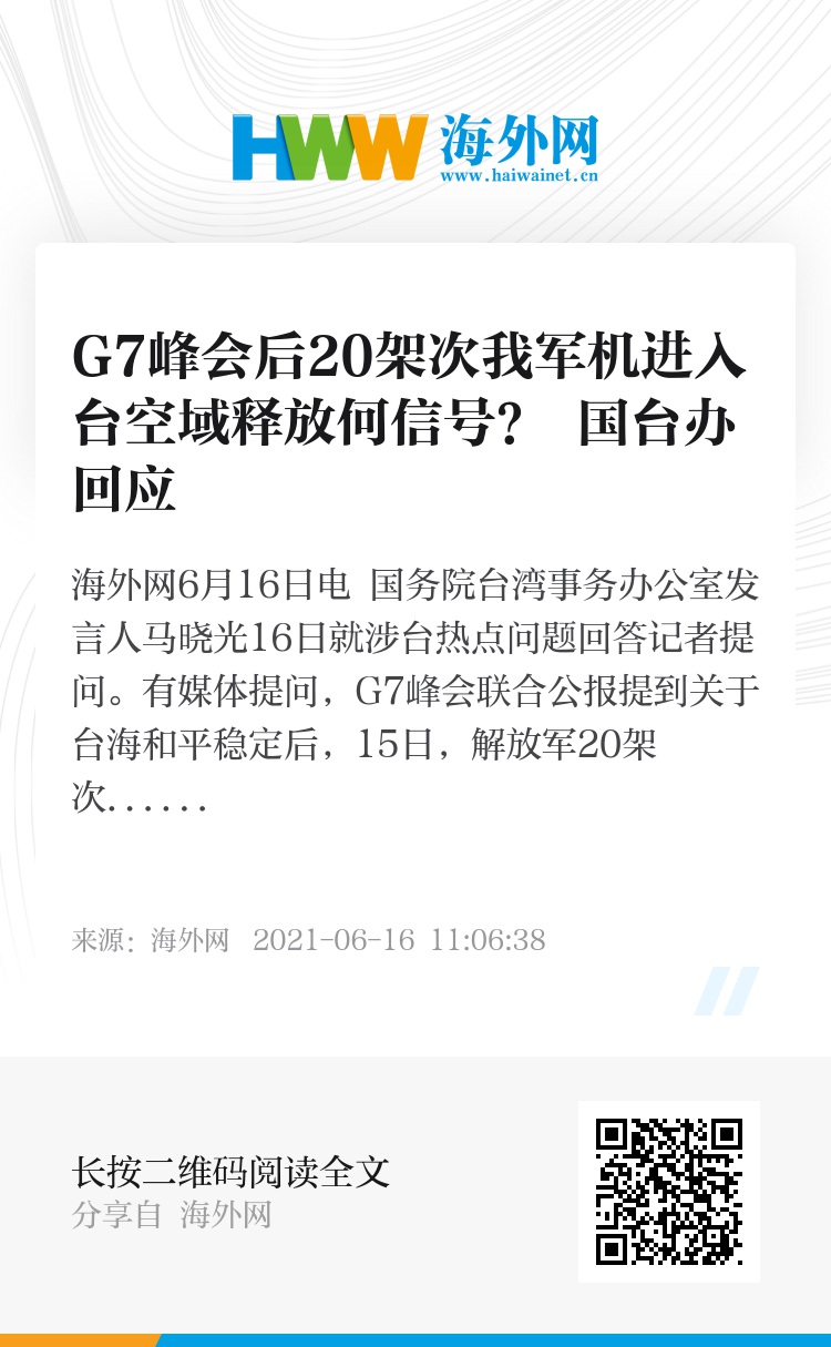 有媒体提问,G7峰会联合公报提到关于台海和平稳定后,15日,解放军20架次军机进入台西南空域。请问发言人,此举是否透露出什么讯息?谢谢。