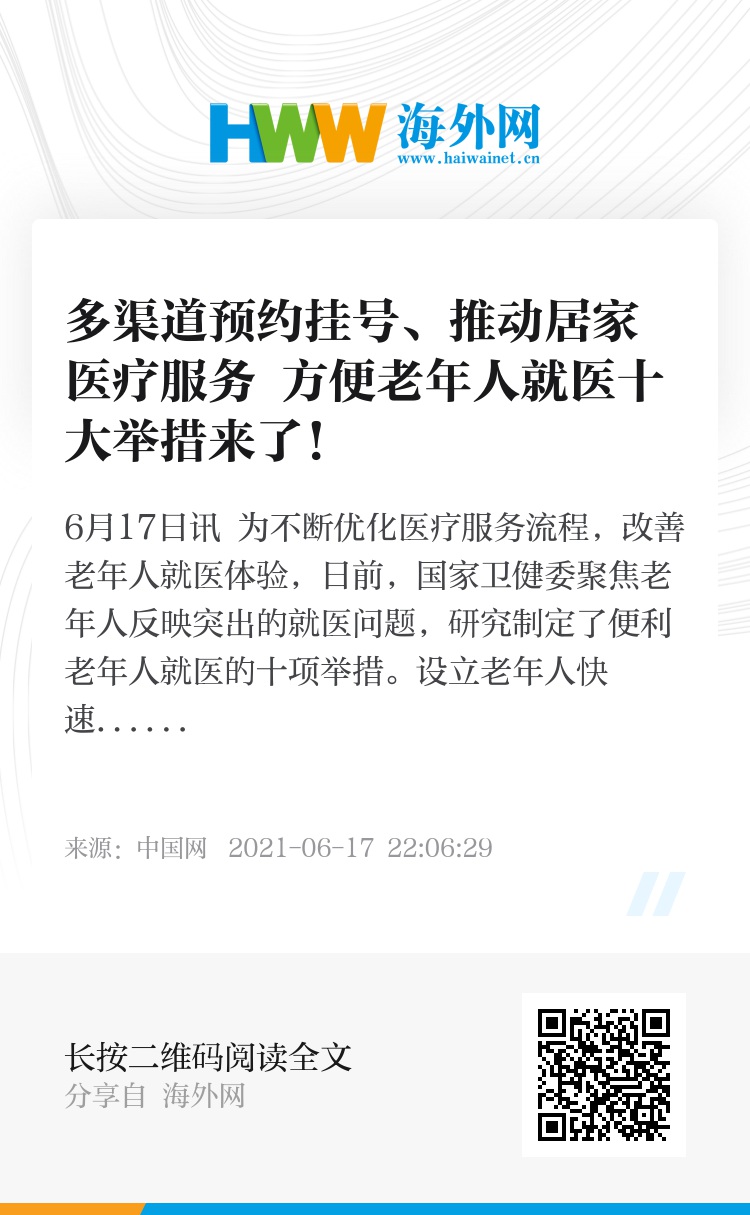 中国网6月17日讯 为不断优化医疗服务流程,改善老年人就医体验,日前,国家卫健委聚焦老年人反映突出的就医问题,研究制定了便利老年人就医的十项举措。