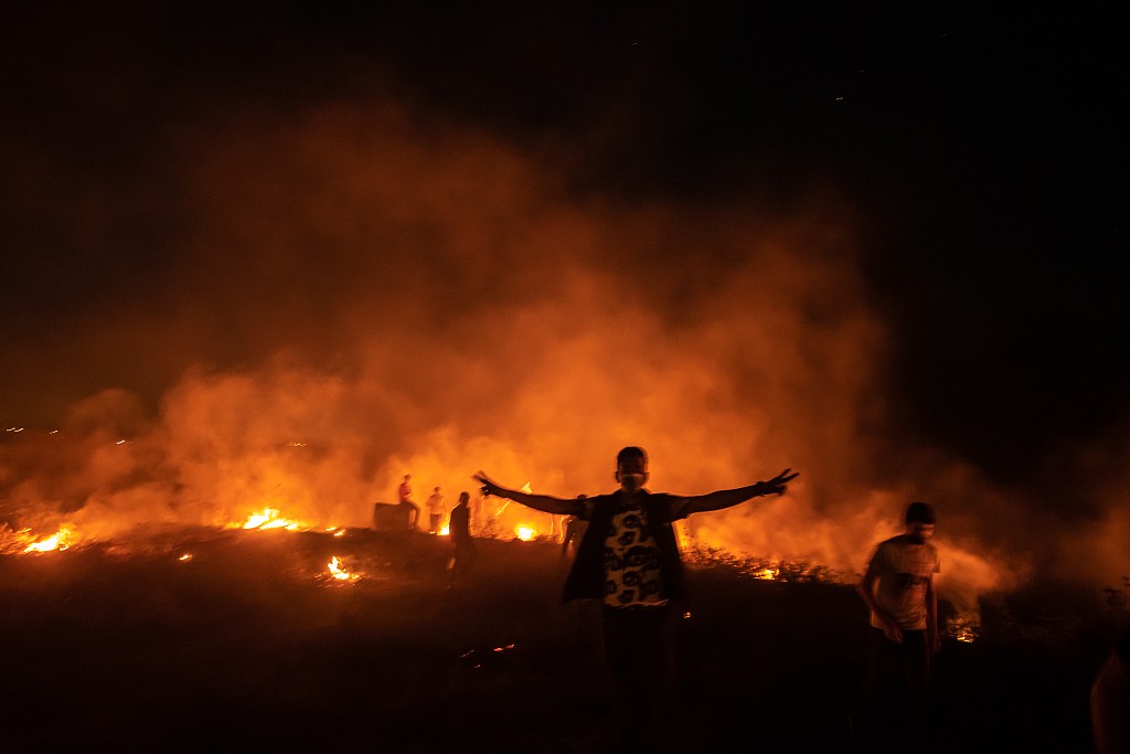 当地时间6月16日,在加沙地区,当地巴勒斯坦民众向以色列南部发射带有燃烧装置的气球,总共引起了十几场大火,一些森林和农田被毁,目前没有人员伤亡。图片来源:人民视觉