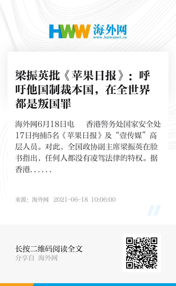海外网6月18日电 香港警务处国家安全处17日拘捕5名《苹果日报》及“壹传媒”高层人员。对此,全国政协副主席梁振英在脸书指出,任何人都没有凌驾法律的特权。