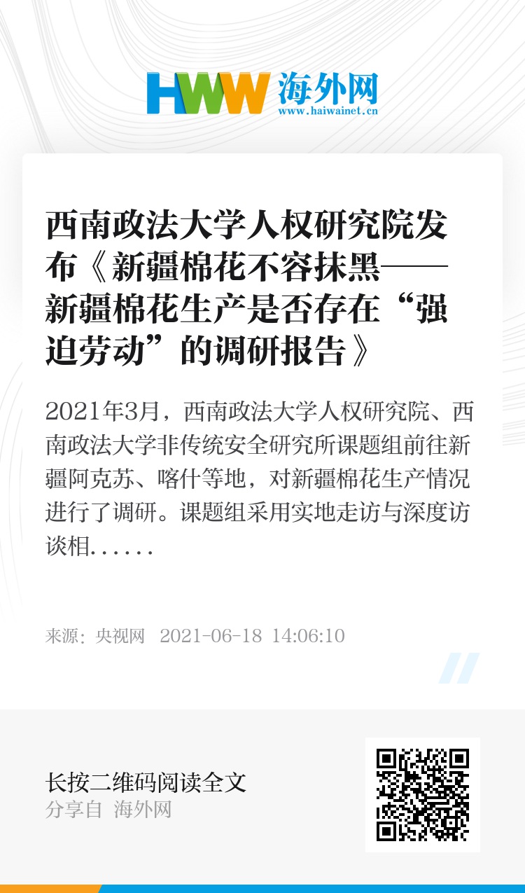 2021年3月,西南政法大学人权研究院、西南政法大学非传统安全研究所课题组前往新疆阿克苏、喀什等地,对新疆棉花生产情况进行了调研。课题组采用实地走访与深度访谈相结合的调研方式,深入了解南疆地区棉花生产机械化情况以及人工采棉情况,并形成了调研报告。