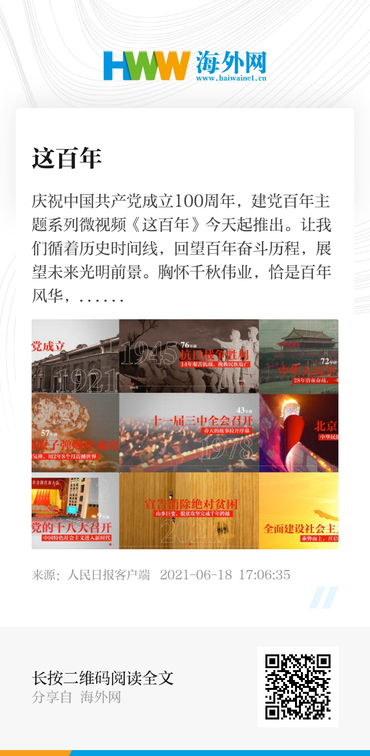 庆祝中国共产党成立100周年,建党百年主题系列微视频《这百年》今天起推出。让我们循着历史时间线,回望百年奋斗历程,展望未来光明前景。胸怀千秋伟业,恰是百年风华,百年大党,风华正茂!