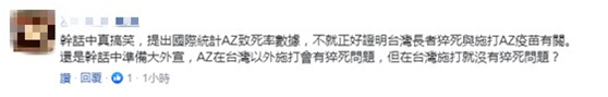 还有网友讽刺:陈时中的话真搞笑,提出国际统计阿斯利康致死率数据,不就正好证明台湾老人猝死与接种阿斯利康疫苗有关。还是陈时中准备大外宣,阿斯利康在台湾以外接种会有猝死问题,但在台湾接种就没有猝死问题?↓