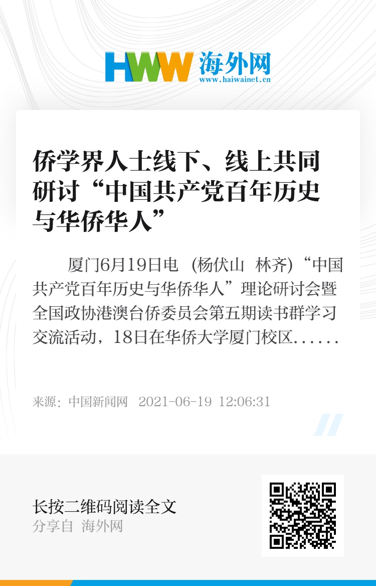 中新网厦门6月19日电 (杨伏山 林齐)“中国共产党百年历史与华侨华人”理论研讨会暨全国政协港澳台侨委员会第五期读书群学习交流活动,18日在华侨大学厦门校区举行,专家学者通过线下线上并行方式,参与理论研讨。