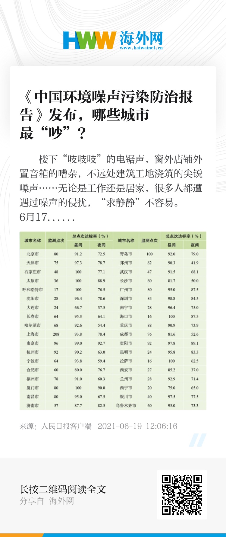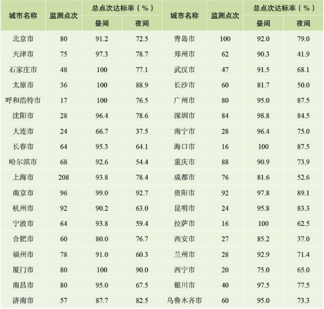 达标率数据如何得出?报告显示,2020年,全国共有311个地级及以上城市报送了功能区声环境质量监测数据,各类功能区共监测23546点次,昼间、夜间各11773点次。昼间共有11143个监测点次达标,达标率为94.6%;夜间共有9427个监测点次达标,达标率为80.1%。