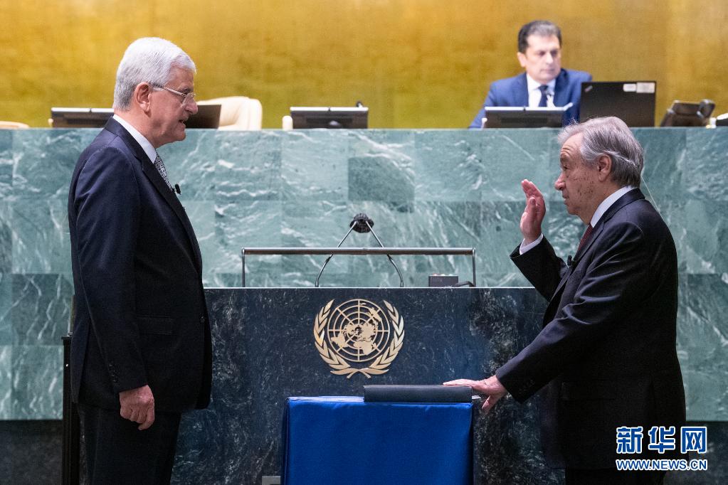 6月18日,在位于纽约的联合国总部,第75届联大主席博兹克尔(前左)主持安东尼奥·古特雷斯(前右)的宣誓仪式。 ​新华社发(联合国供图/埃瑟金德尔·德贝贝摄)