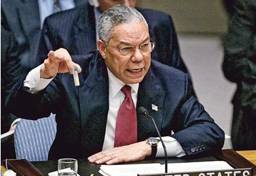△美国前国务卿鲍威尔在2003年的联合国安理会上拿出了一试管“不明物质”作为“证据”,指责伊拉克的“生化武器”能造成“巨大杀伤”