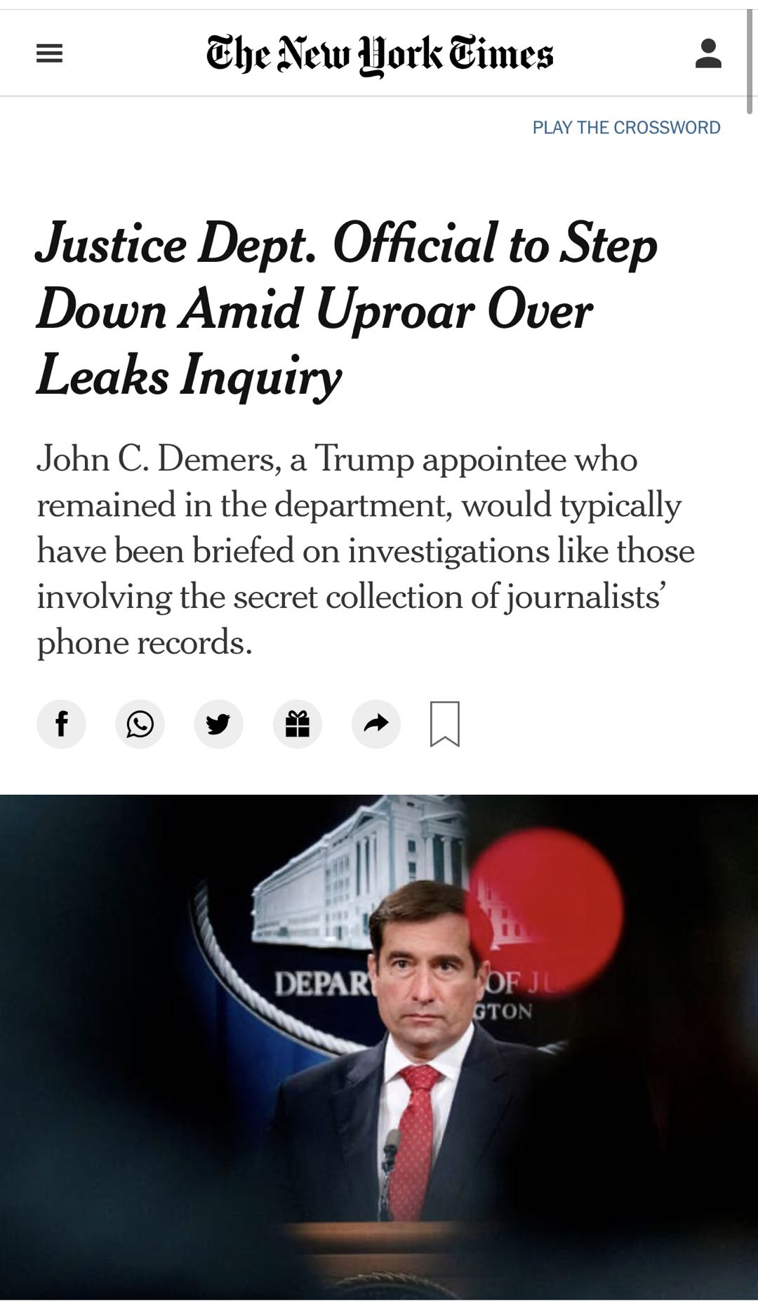 △《纽约时报》报道,美国司法部秘密传唤国会议员通讯记录风波未平之际,司法部国家安全高官德莫斯宣布辞职