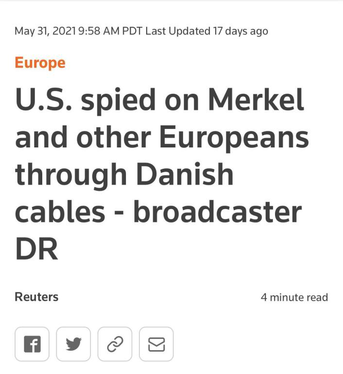 无独有偶,今年5月末,丹麦国家电视台的一位工作人员向媒体爆料,美国国家安全局曾利用丹麦对欧洲各国政要进行监听,被监听对象包括瑞典、挪威、法国和德国,其中甚至包括前德国外长施泰因迈尔和前德国反对党领袖施泰因布吕克等高级官员。该事件一经报道,立即引起舆论的轩然大波。德国总理默克尔和法国总统马克龙要求美国给出合理解释,然而直至今日,美国国家安全局仍未对此作出任何回应。
