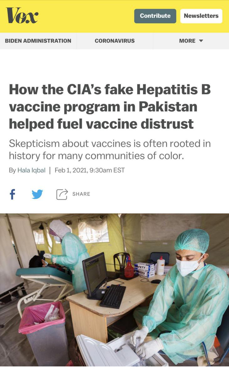 △美国媒体Vox报道,CIA用乙肝疫苗作掩护来接近本拉登,导致巴基斯坦人民至今无法信任新冠疫苗