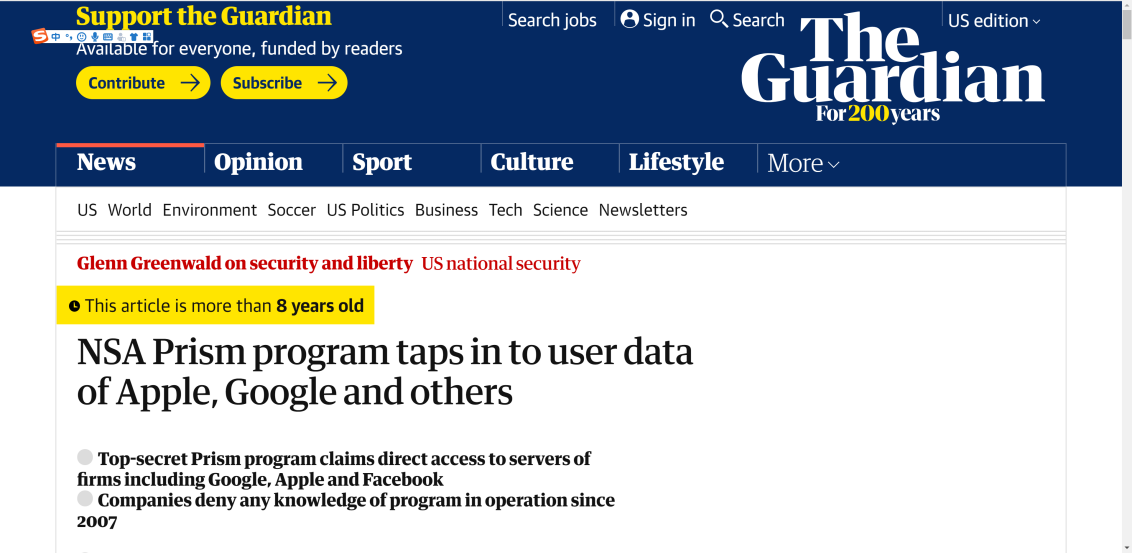 △《卫报》报道,美国国家安全局利用棱镜计划获取苹果和谷歌等互联网巨头的用户信息