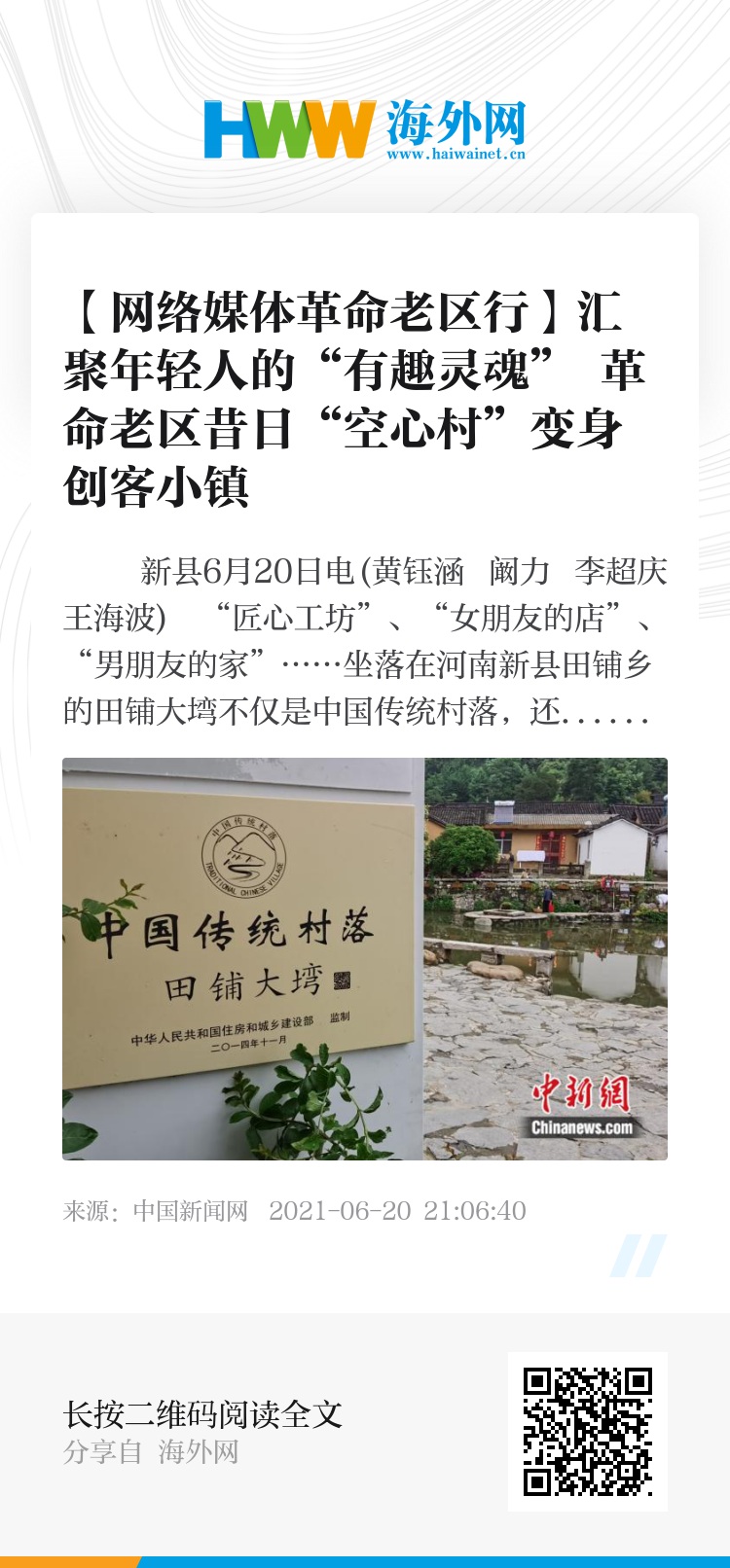 中新网新县6月20日电(黄钰涵 阚力 李超庆 王海波) “匠心工坊”、“女朋友的店”、“男朋友的家”……坐落在河南新县田铺乡的田铺大塆不仅是中国传统村落,还是一个汇集了多家大学生创意小店的创客小镇。日前,“在这里读懂初心使命——网络媒体革命老区行”网络主题活动采访团走进这里,感受年轻创客们的“有趣灵魂”。