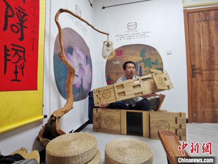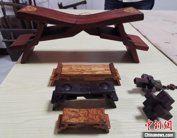 工作室内,大小不一、形制精美的鲁班枕、鲁班锁、案几、书架整齐摆放。仔细观察,这些物件均没有使用一钉一铆,各部件之间却扣合严密、联接牢固。乔一兵向记者介绍,这使用的是充满中国智慧的榫卯工艺。