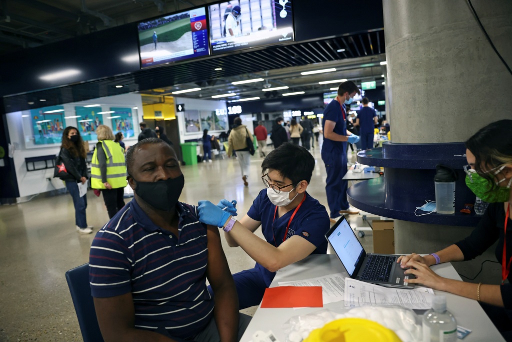 当地时间2021年6月20日,英国伦敦,热刺主场被用做新冠疫苗接种中心,大批伦敦市民排队接种。图片来源:澎湃影像