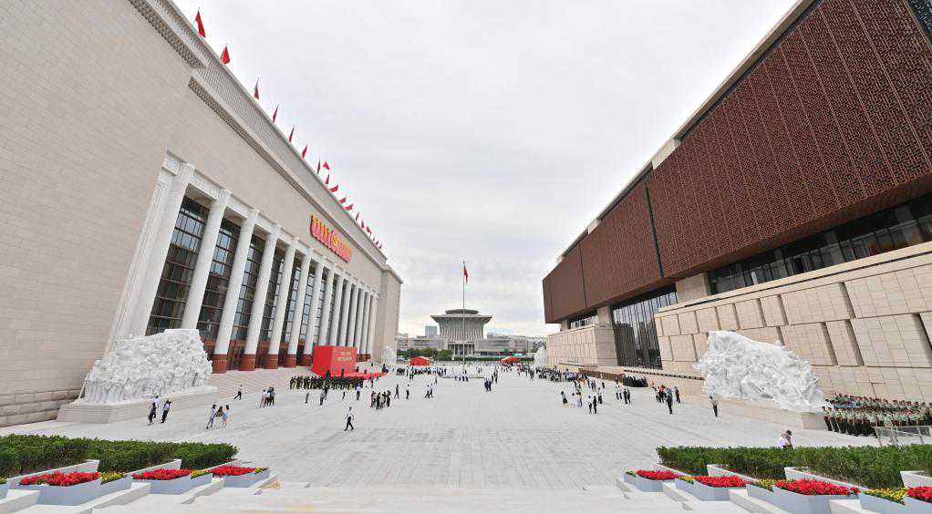 中国共产党历史展览馆西侧广场上,名为《旗帜》《信仰》《伟业》《攻坚》《追梦》的五组雕塑庄严矗立,气势恢宏。