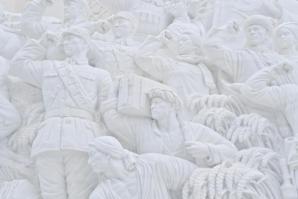 细节一:73位人物形象团结一致。雕塑以“团块结构”作为主体造型语言,73位人物形象融入主体之中,形成团结一致、阔步前行的恢宏阵势,塑造了农民、工人、新经济工作者、党政干部、知识分子和军人形象,各民族的人物形象将生活场景、民族风情进行了诗意化的表现。