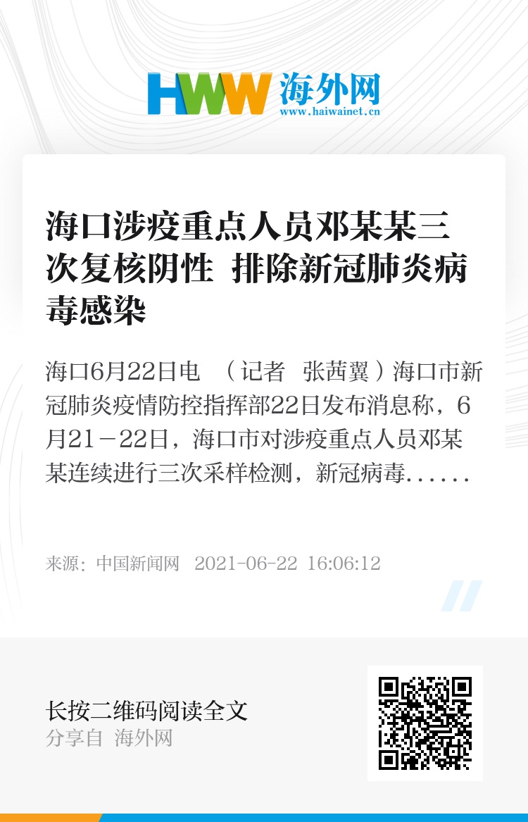 中新网海口6月22日电 (记者 张茜翼)海口市新冠肺炎疫情防控指挥部22日发布消息称,6月21-22日,海口市对涉疫重点人员邓某某连续进行三次采样检测,新冠病毒核酸检测结果均为阴性。按照《新型冠状病毒肺炎防控方案(第八版)》相关规定,结合核酸检测结果、临床表现和疫苗接种史等,排除邓某某新冠肺炎病毒感染。