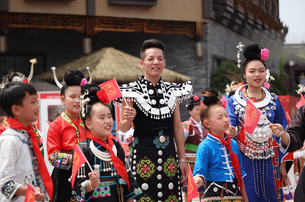 2021年6月22日,当日,贵州省黔东南苗族侗族自治州丹寨县万达小镇举行“唱支山歌给党听”主题快闪活动,100多名各族群众身着节日盛装,在轻松、欢快的氛围中,用汉、苗双语歌唱祖国繁荣昌盛和人民幸福生活,庆祝中国共产党建党100周年。图片来源:IC photo