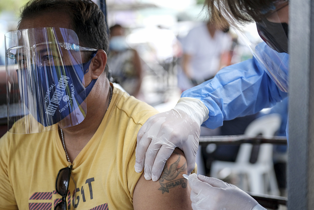 当地时间2021年6月22日,菲律宾马尼拉,市民在街头接种新冠疫苗。当地在户外设立免下车接种点,不少快递员和摩的司机在排队等候。图片来源:人民视觉
