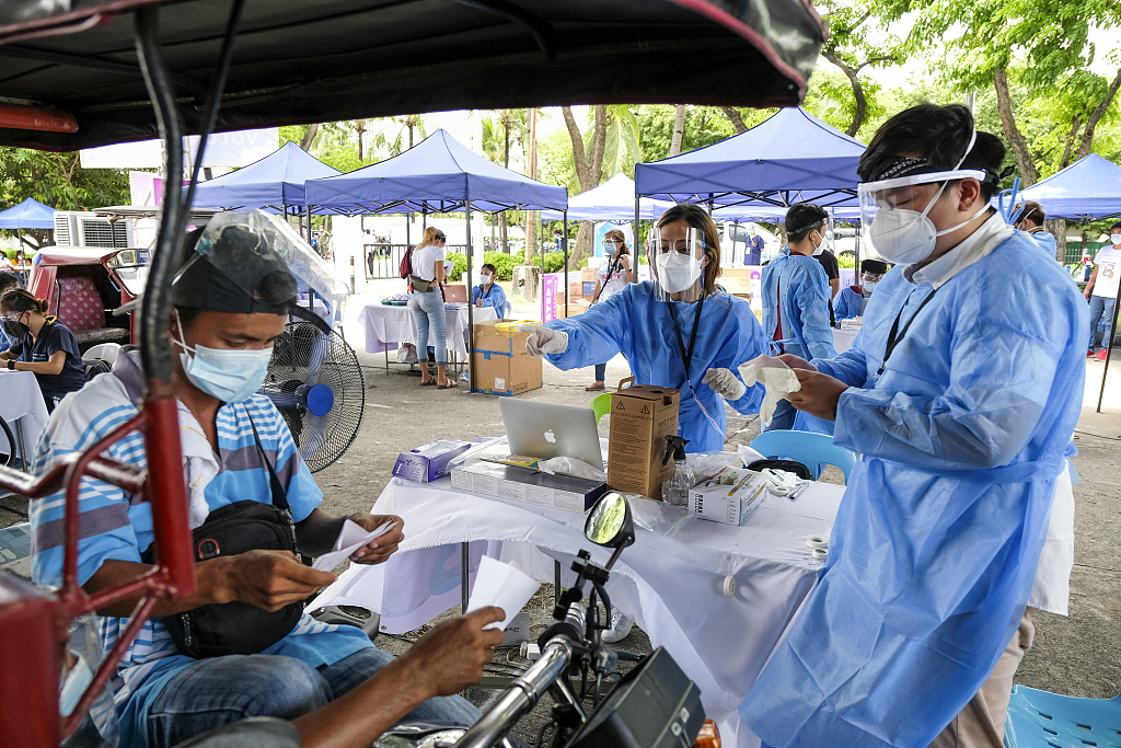 当地时间2021年6月22日,菲律宾马尼拉,市民在街头接种新冠疫苗。当地在户外设立免下车接种点,不少快递员和摩的司机在排队等候。图片来源:人民视觉