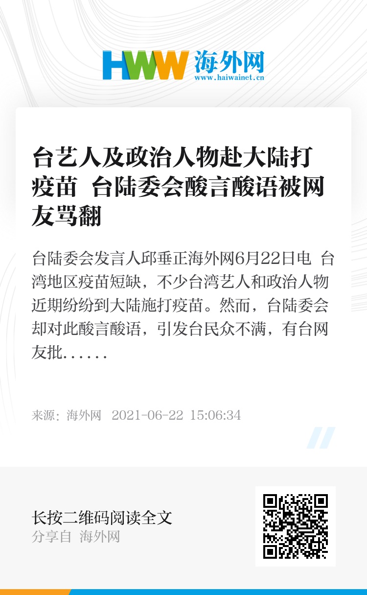 海外网6月22日电 台湾地区疫苗短缺,不少台湾艺人和政治人物近期纷纷到大陆施打疫苗。然而,台陆委会却对此酸言酸语,引发台民众不满,有台网友批评,“台湾疫苗动作慢,却怪别人”“普通老百姓要保命,有错吗?”