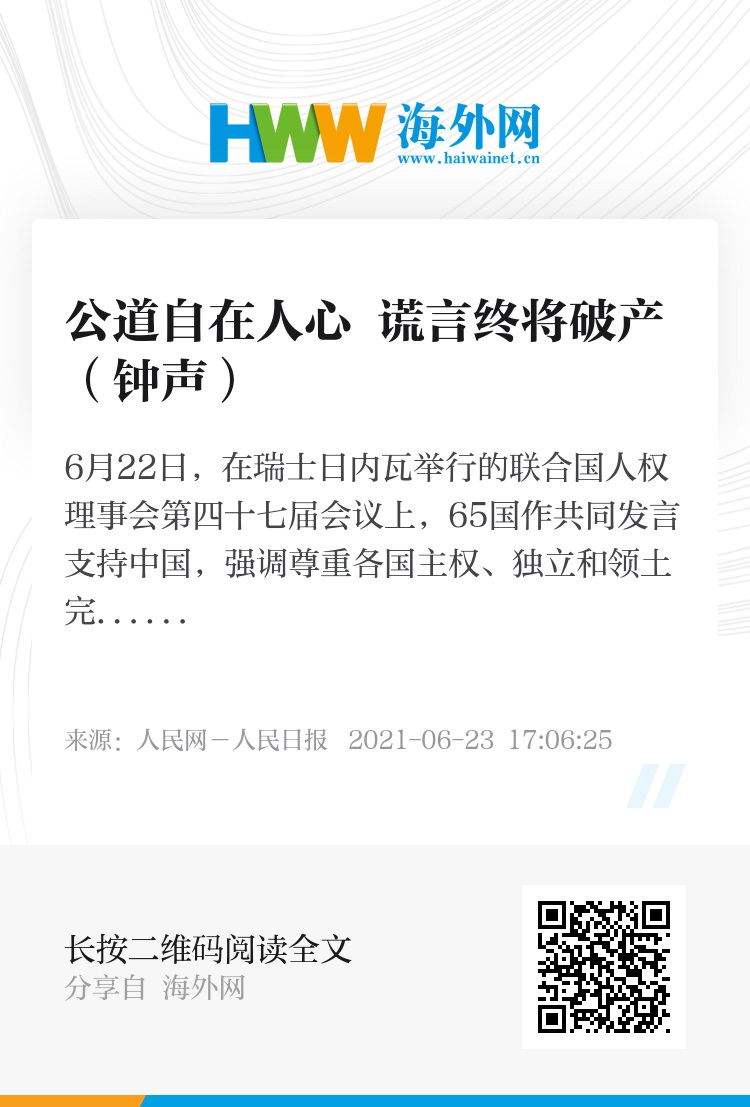 6月22日,在瑞士日内瓦举行的联合国人权理事会第四十七届会议上,65国作共同发言支持中国,强调尊重各国主权、独立和领土完整,不干涉主权国家内政是国际关系基本准则,香港、新疆、西藏事务是中国内政,外界不应干涉,主张恪守联合国宪章宗旨和原则,尊重各国人民根据国情自主选择人权发展道路的权利,反对将人权问题政治化和双重标准,反对出于政治动机、基于虚假信息对中国进行无理指责,反对以人权为借口干涉中国内政。海合会6国联合致函支持中国立场,20多国以单独发言等方式支持和呼应中国。90多个国家在人权理事会发出正义的声音,如黄钟大吕般掷地有声、铿锵有力,第一时间从日内瓦万国宫传向世界的各个角落。