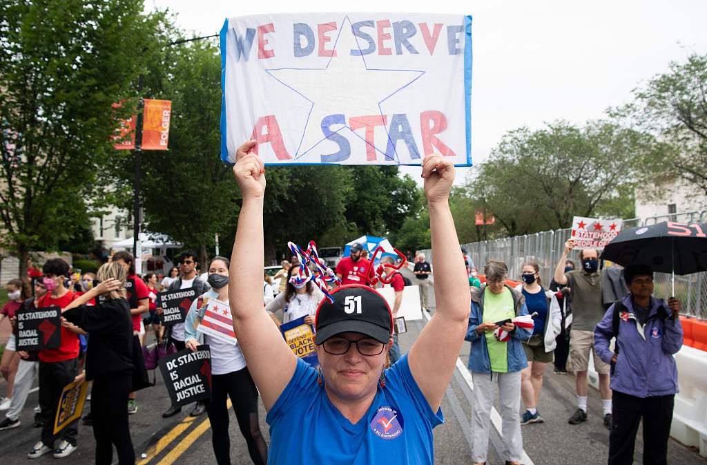 当地时间6月22日,美国华盛顿特区居民举行集会,支持哥伦比亚华盛顿特区成为美国的第51个州。图片来源:人民视觉